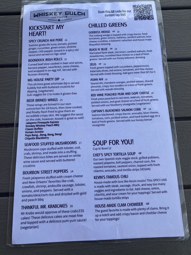Introducing Whiskey Gulch CoffeePub, a venue and event space offering burgers and bar fare in Port Orchard, WA. With a diverse menu featuring vegan options, outdoor seating, and a full bar, this spot is perfect for breakfast, lunch, or happy hour. Customers rave about the friendly service and delicious food, including juicy burgers, flavorful wings, and the best French fries in town. The rotating tap list and extensive whiskey selection add to the experience. The cozy atmosphere and scenic views of Sinclair Inlet make it a top choice for a casual meal or gathering. Whether you're craving a classic burger or looking to explore new flavors, Whiskey Gulch CoffeePub delivers on taste, variety, and hospitality. Visit for a warm vibe, top-notch service, and a memorable dining experience.